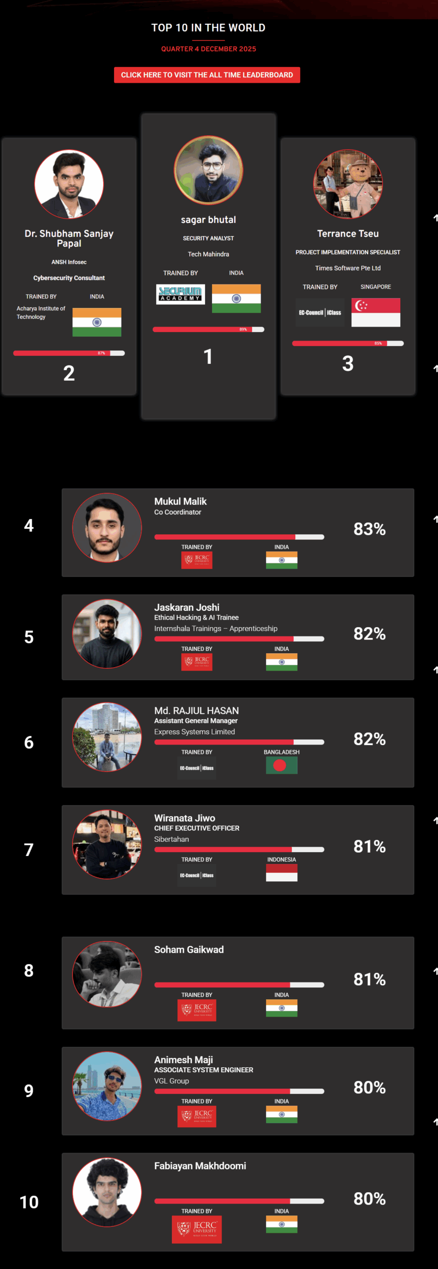 To feature on the leaderboard, you will have to pass both, the CEH knowledge-based MCQ (v8 and above) and the CEH Practical exam, thereby attaining the CEH (Master) credential. Scoring is based on the marks obtained and time taken to pass the exam. EFFICIENCY IS THE KEY.